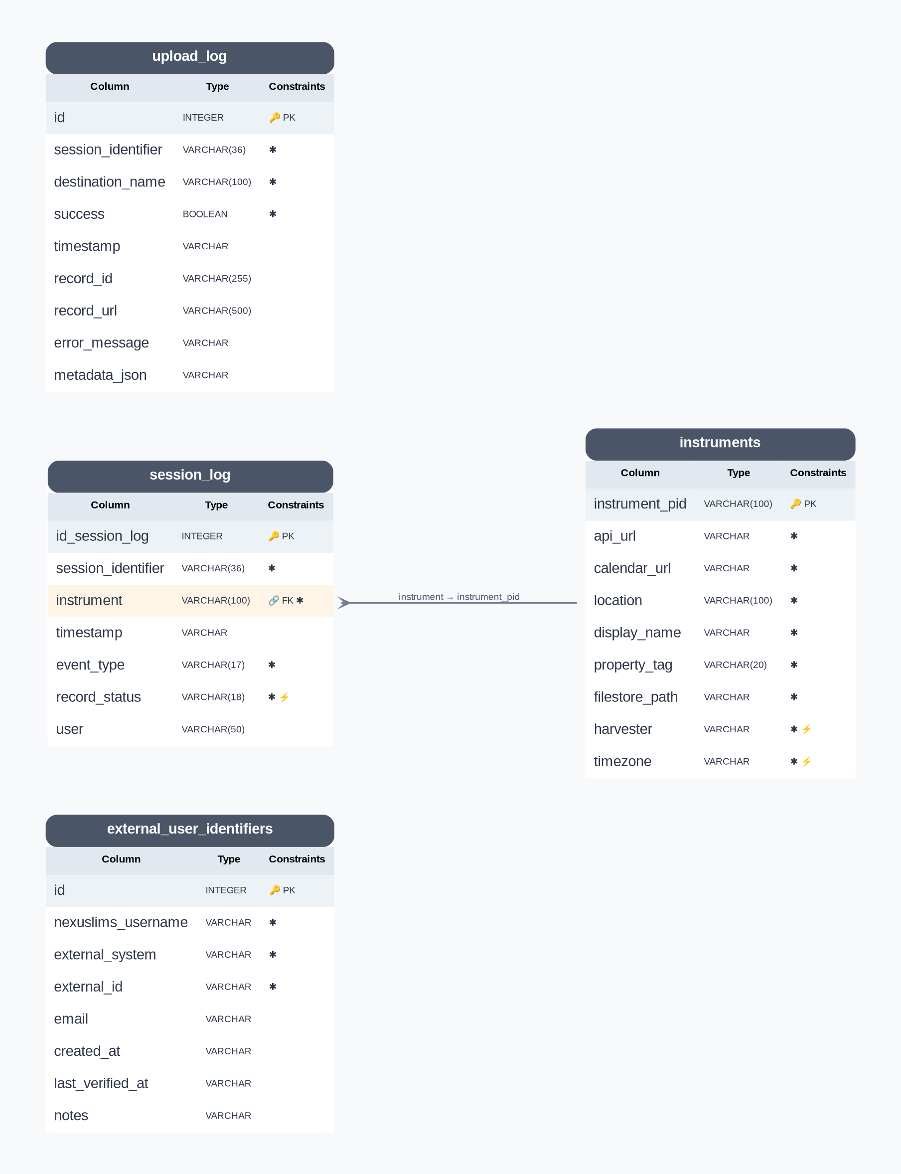 The session_log table tracks experimental sessions from start to finish. Harvesters (like nemo) populate this table by parsing reservation system APIs and creating timestamped event logs.
