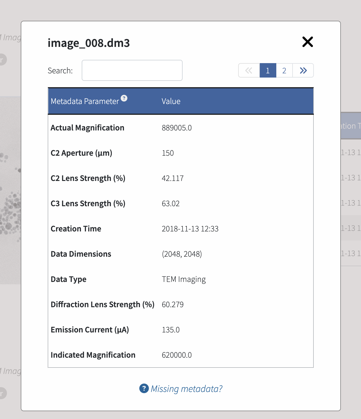 Display and filtering of technical metadata for individual datasets (voltage, magnification, etc.).#